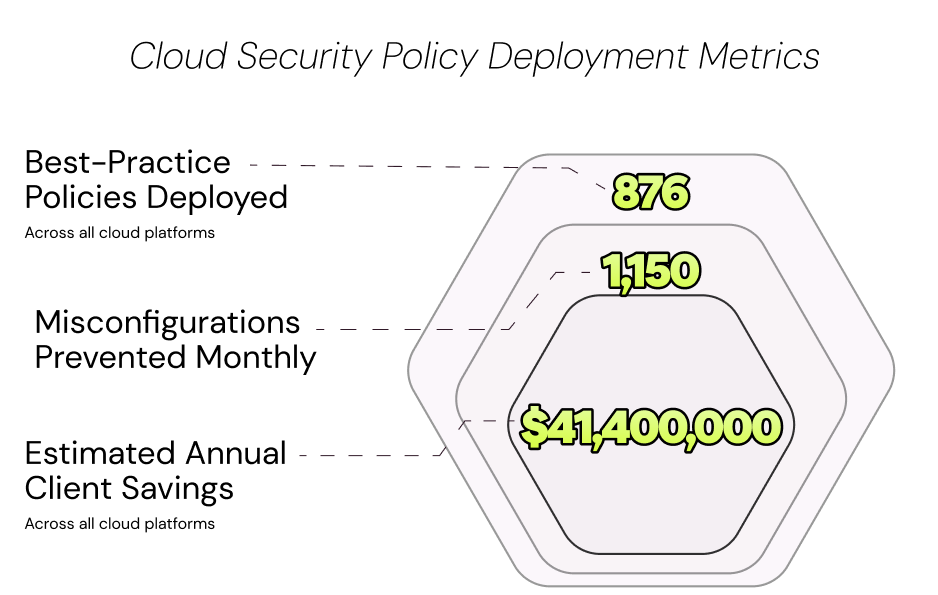 ● 876 Best-Practice and Custom Policies Deployed: We went far beyond generic templates, delivering nearly 900 finely tuned policies tailored across AWS, Azure, and GCP, granular protection that manual processes could never sustain.